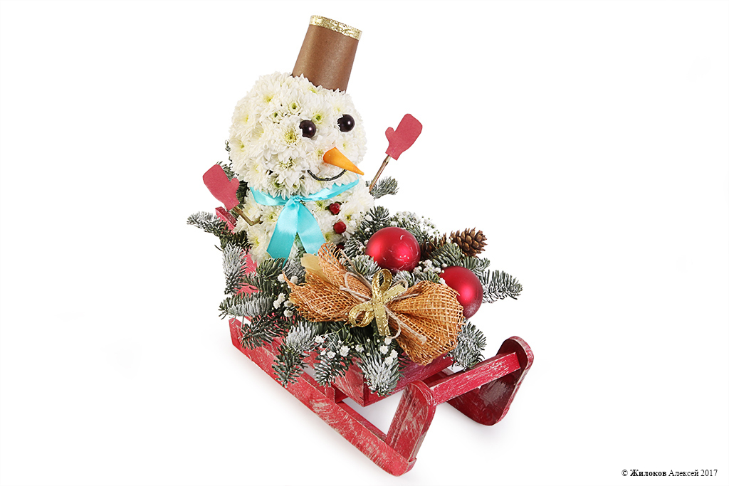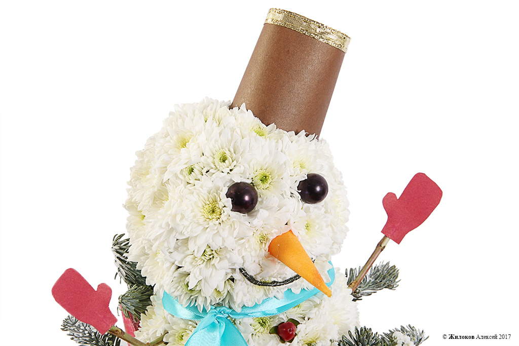 Сказочный Снеговичок из цветов, как по мановению волшебной палочки, создаст неповторимую праздничную атмосферу, наполнит дом настоящей новогодней сказкой. Такой новогодний подарок придется по нраву как детям, так и взрослым, и принесет каждому много радости и позитивных эмоций!