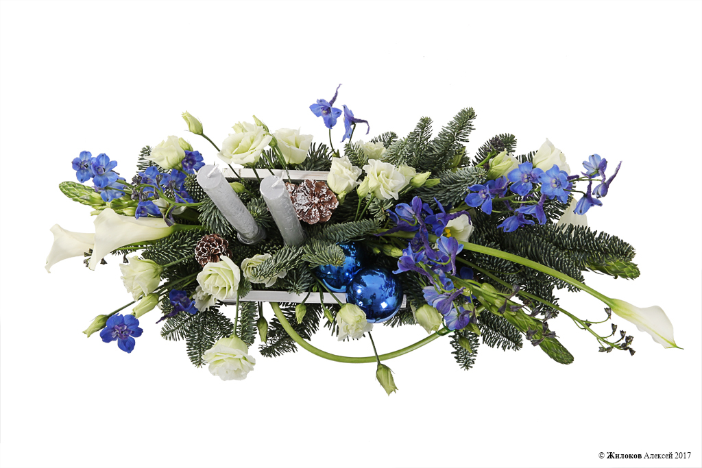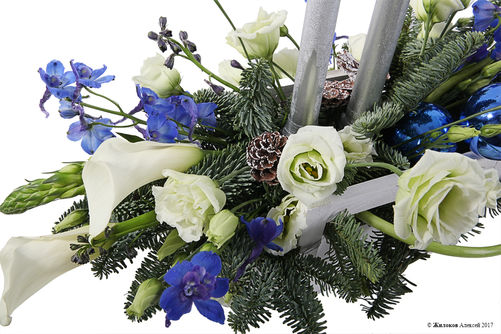 Состав: Нобилис - 1Калла - 4 Дельфиниум - 3 Эустома - 1 Орнитогалум - 3 Свеча (25 см) - 2 Шишка еловая - 3 Шар новогодний - 2 Кашпо "Шене" - 1 |