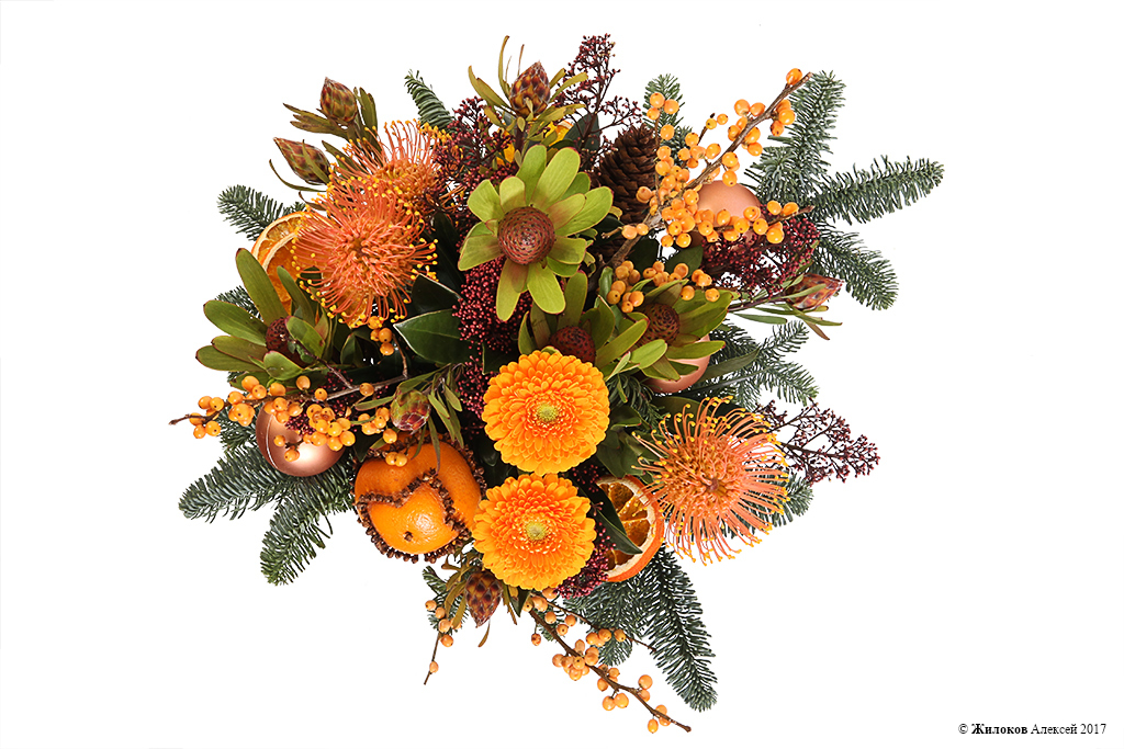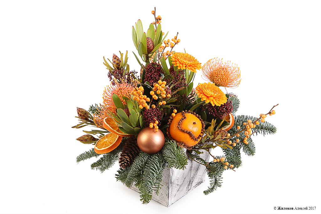 Состав: Нобилис - 3Скиммия - 1 Леукоспермум - 3 Илекс - 3 Плюмозиум - 1 Гербера - 2 Шар новогодний - 3 Шишка еловая - 3 Долька апельсина - 1 Кашпо "Сердце" - 1 |