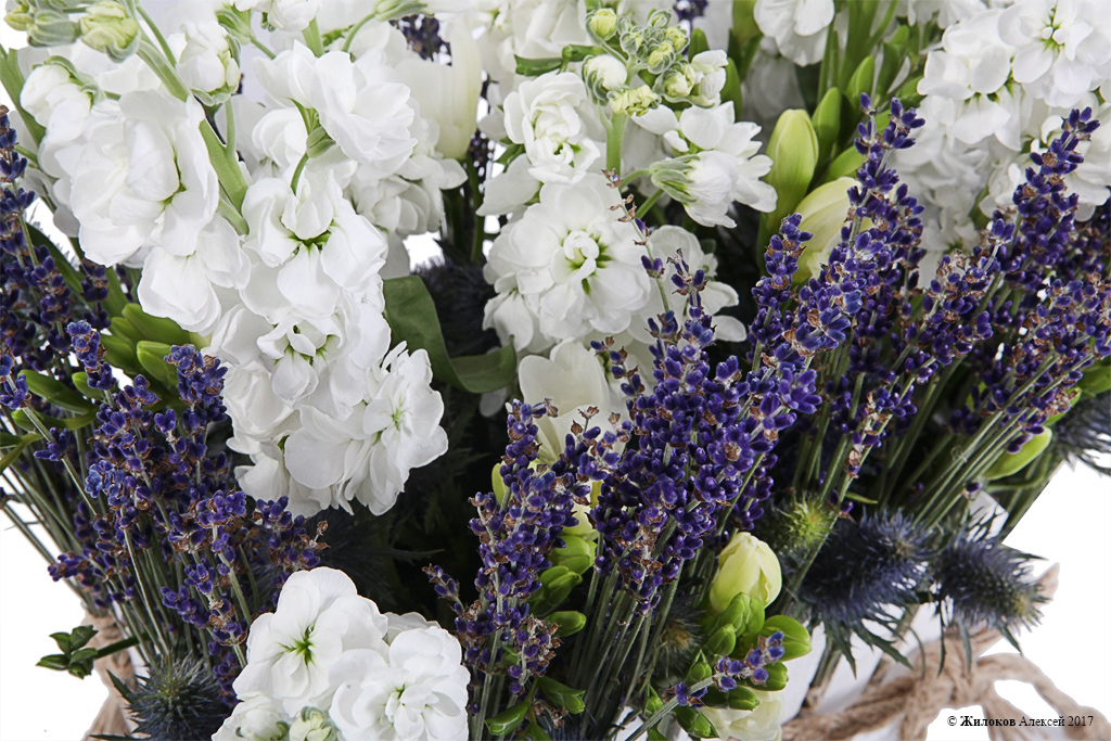 Состав: Лилия - 1Роза Аваланш - 3 Фрезия - 6 Эустома - 0.5 Вероника - 6 Трахелиум - 4 Сетария - 2 Эвкалипт - 0.5 Сильвер бруния - 0.5 Кашпо "Рояль" - 1 |