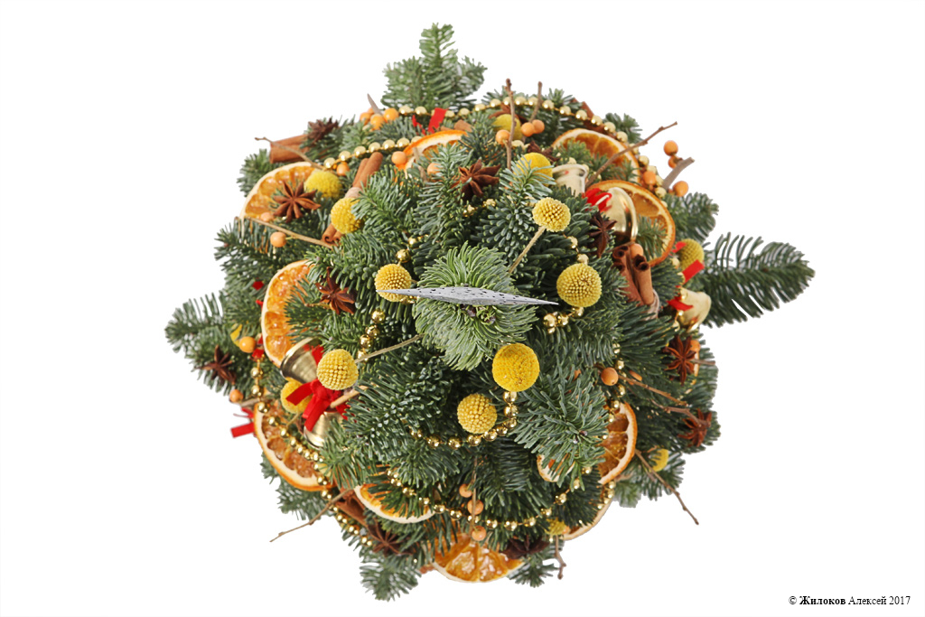 Состав: Нобилис - 7Краспедия - 20 Украшение на палочке - 8 Долька апельсина - 20 Декор "Анис" - 1 Оазис "Конус" (40х12 см) - 1 Набор "Корица" (25г) - 1 Илекс - 2 |