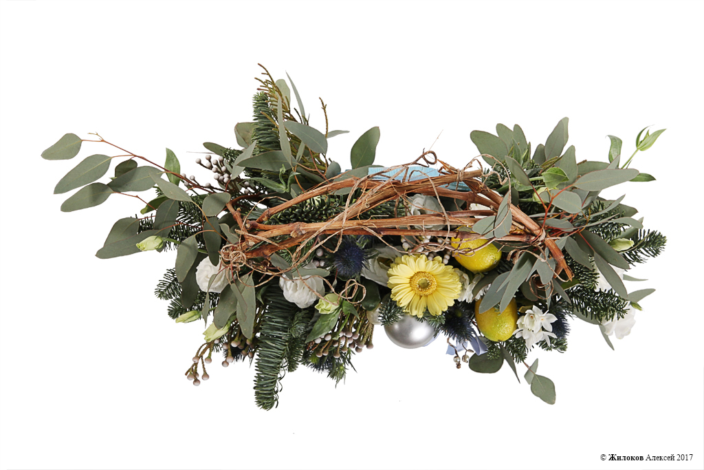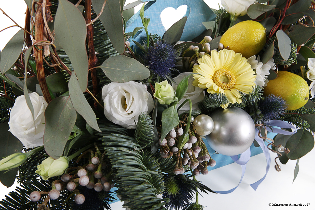 Состав: Нобилис - 1Декор "Лимон" - 2 Эустома - 1 Нарцисс (деффодайл) - 2 Эвкалипт - 0.5 Сильвер бруния - 0.5 Эрингиум - 1 Шар новогодний - 1 Лоза (банч) - 0.5 Кашпо "Елка Базель-1" - 1 Гербера - 1 |