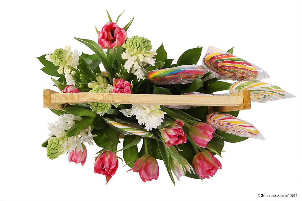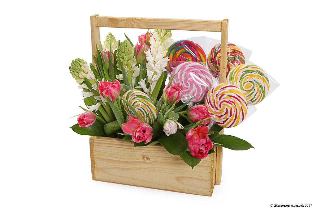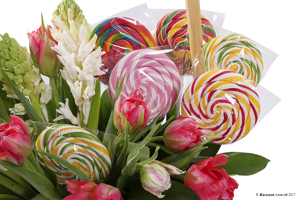 Красочная и колоритная цветочная композиция, которая привнесет в любое поздравление яркие краски и положительные эмоции! Пеструю цветовую палитру в композицию добавляют разноцветные леденцы на палочке, вид и вкус которых унесут получателя в мир беззаботного детства! Такой подарок создаст нужное праздничное настроение и подарит незабываемые впечатления!