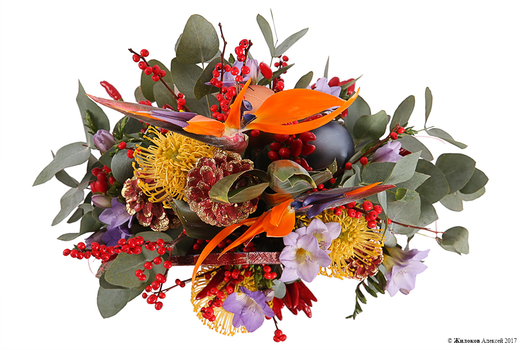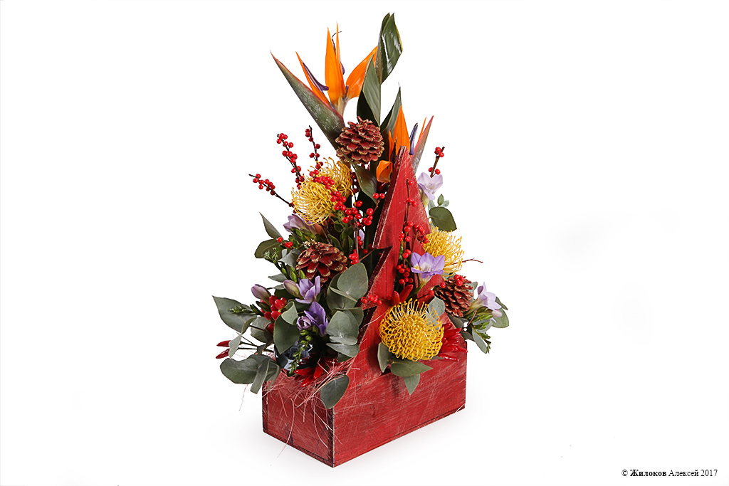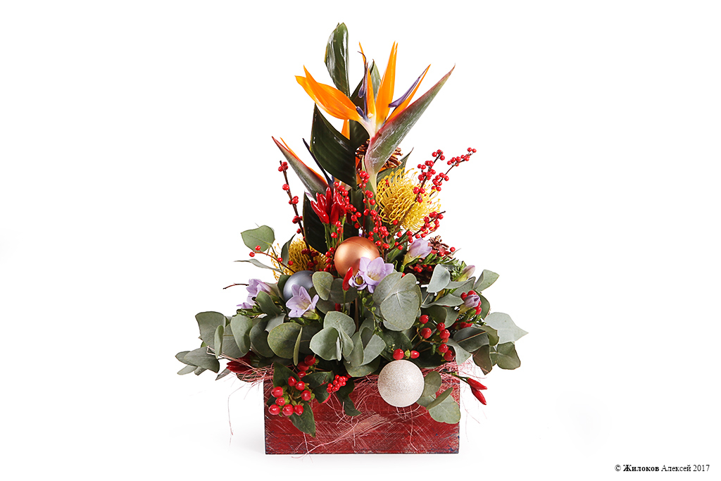 Описание: Оригинальная новогодняя композиция из цветов, сосновых шишек и елочных шаров станет самым необычным подарком, который адресат получал когда-либо. Стильный и экзотический вид композиции придает яркий стрелки стрелиции и золотые шары леукоспермума. |