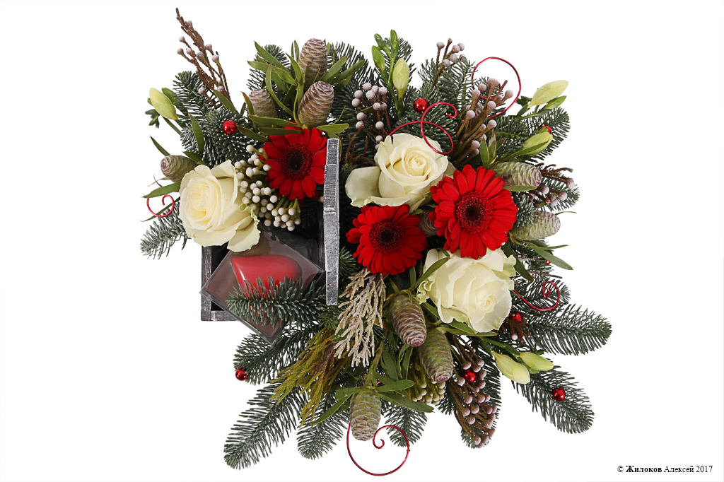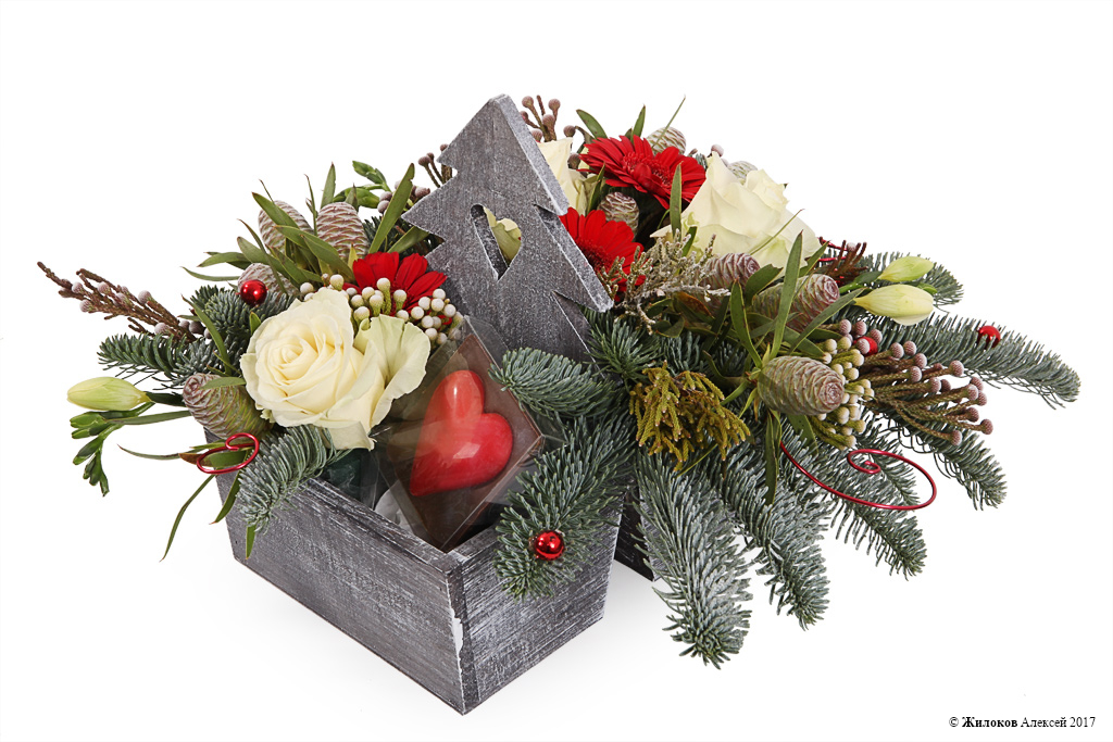 Яркий и необычный подарок, который украсит собой любой интерьер и наполнит Ваш дом волшебной атмосферой зимнего леса. Такая цветочная композиция в деревянном кашпо создаст особый уют и неповторимый колорит. А плитка фигурного молочного шоколада в форме сердца станет замечательным дополнением для любителей сладкого!