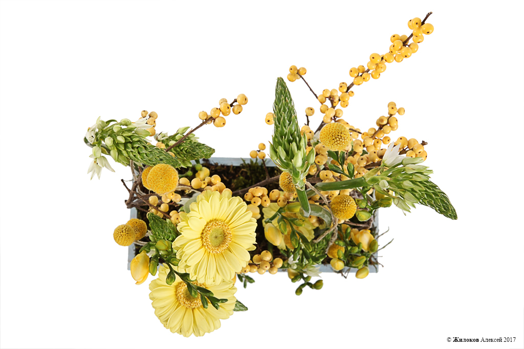 Состав: Гербера мини - 3Орнитогалум - 10 Илекс - 5 Краспедия - 10 Фрезия - 10 Мох плаун (100 г) - 0.3 Кашпо "Ящик" (дерево) - 1 |