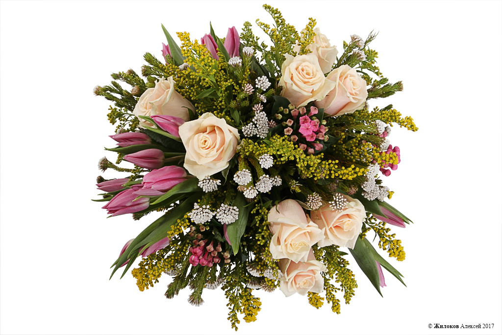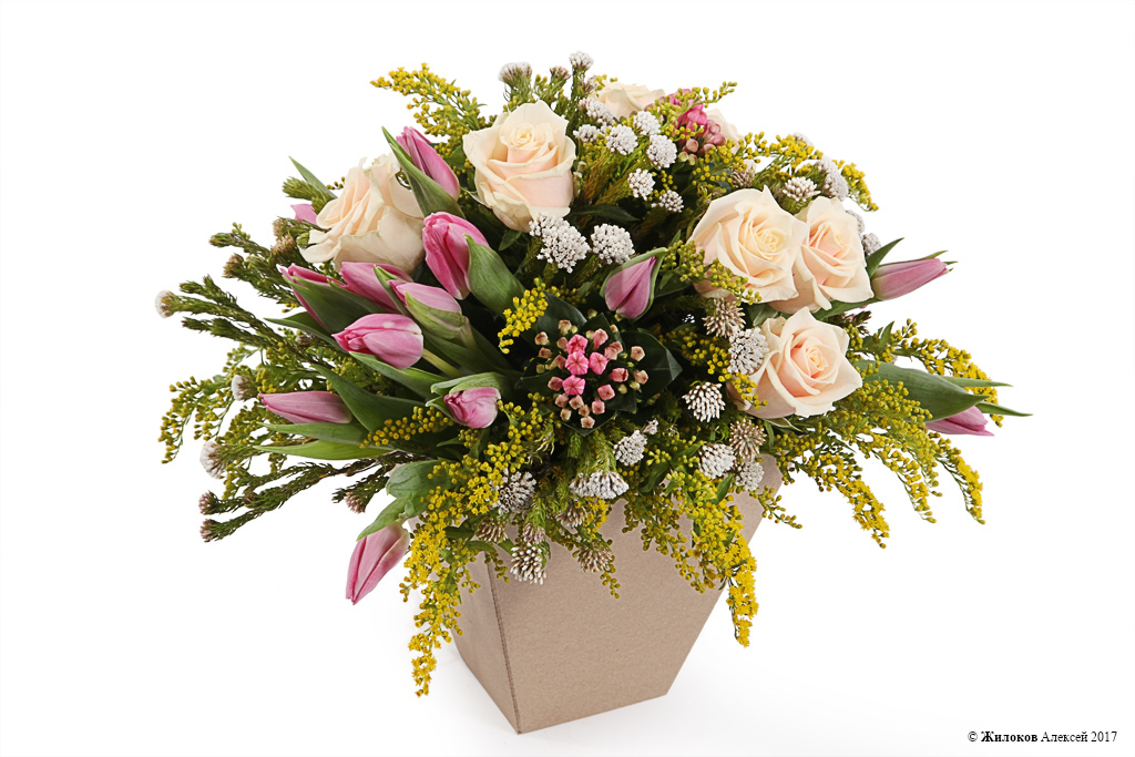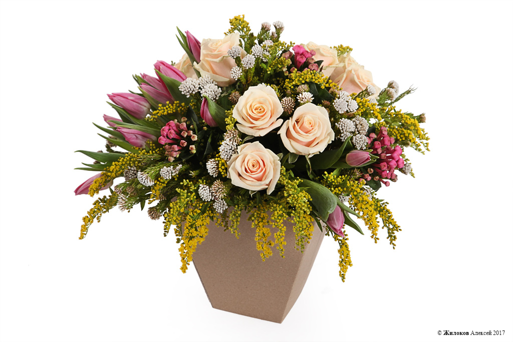 Пушистые желтые веточки солидаго, словно первые лучики весеннего солнца через облака, пробиваются меж кремовых бутонов роз и нежных тюльпанов. Такая цветочная композиция непременно вызовет только положительные эмоции и одарит чувством заботы и искренней теплоты.