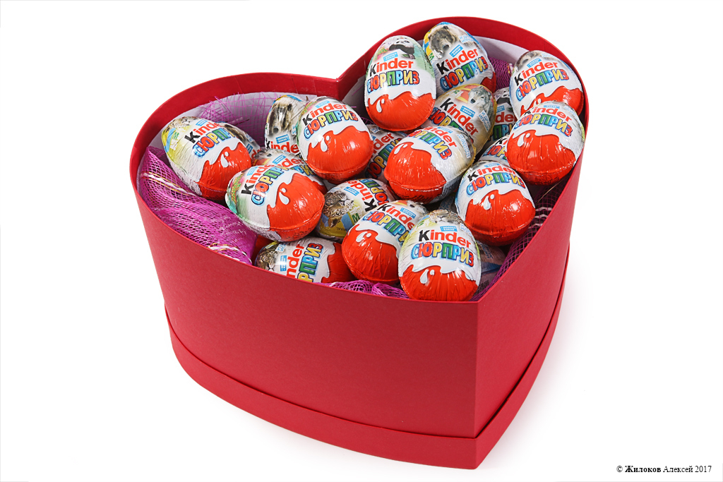 Состав: Шоколадное яйцо «Киндер сюрприз» - 50Коробка "Сердце" (30х25х16) - 1 |