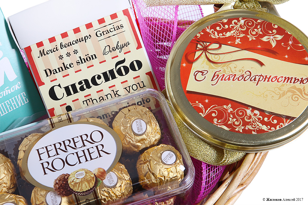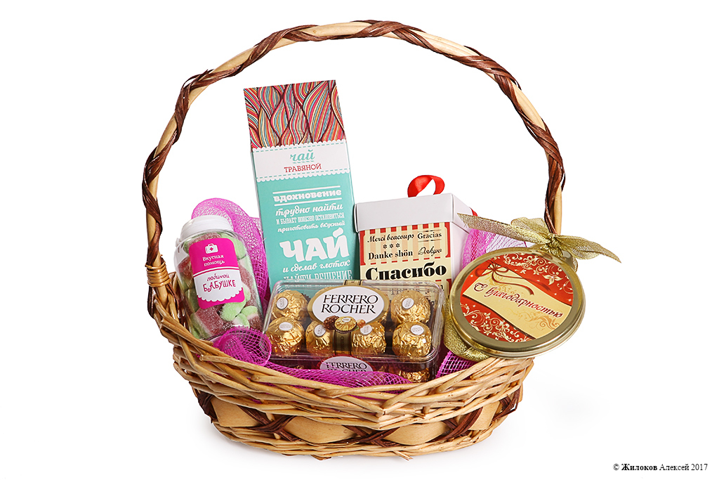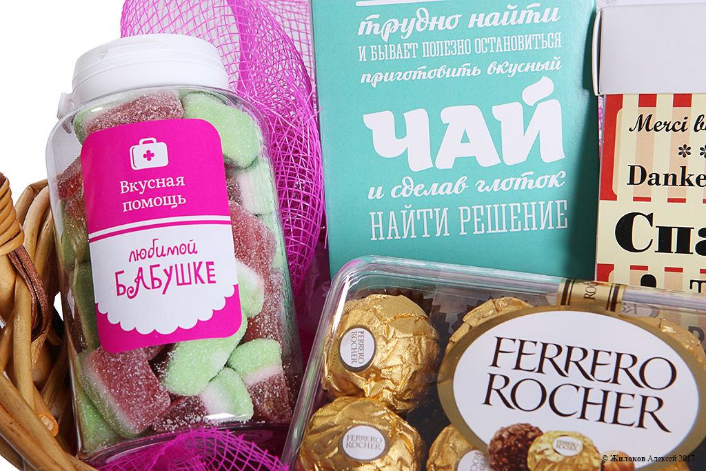 Состав: Чай «Вдохновение»Конфеты «Ферреро» Печенье «Спасибо» Конфеты «Любимой бабушке» Шоколадная медаль «С благодарностью» Корзина |