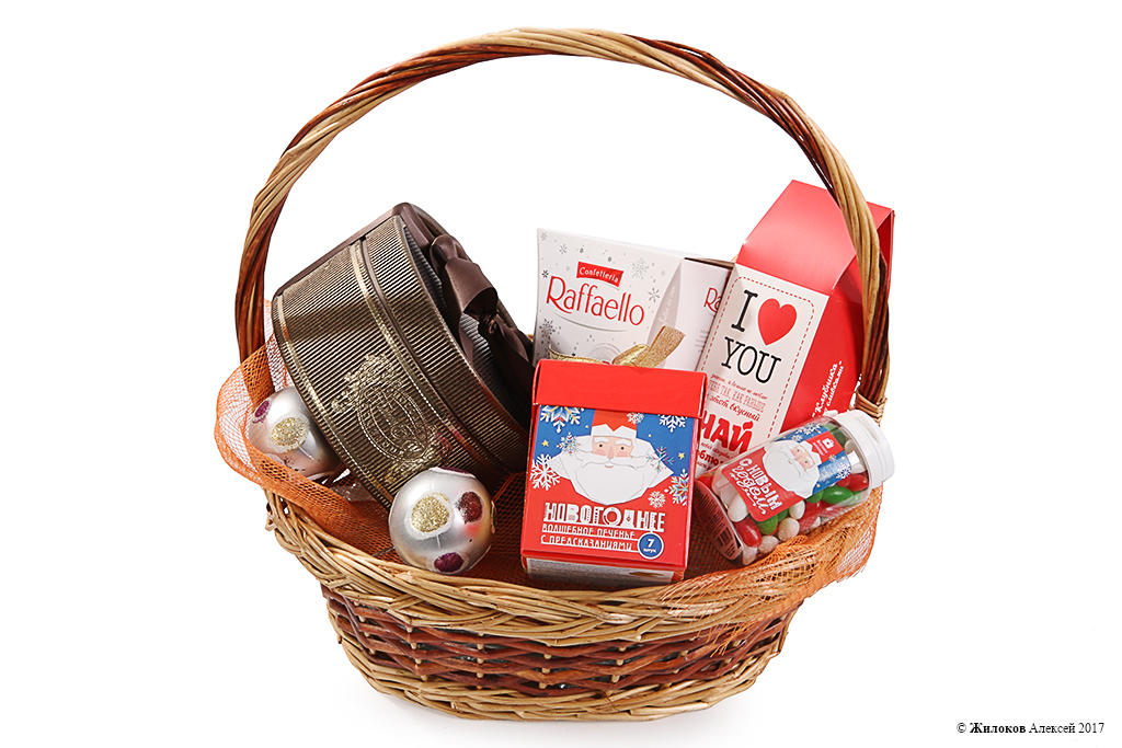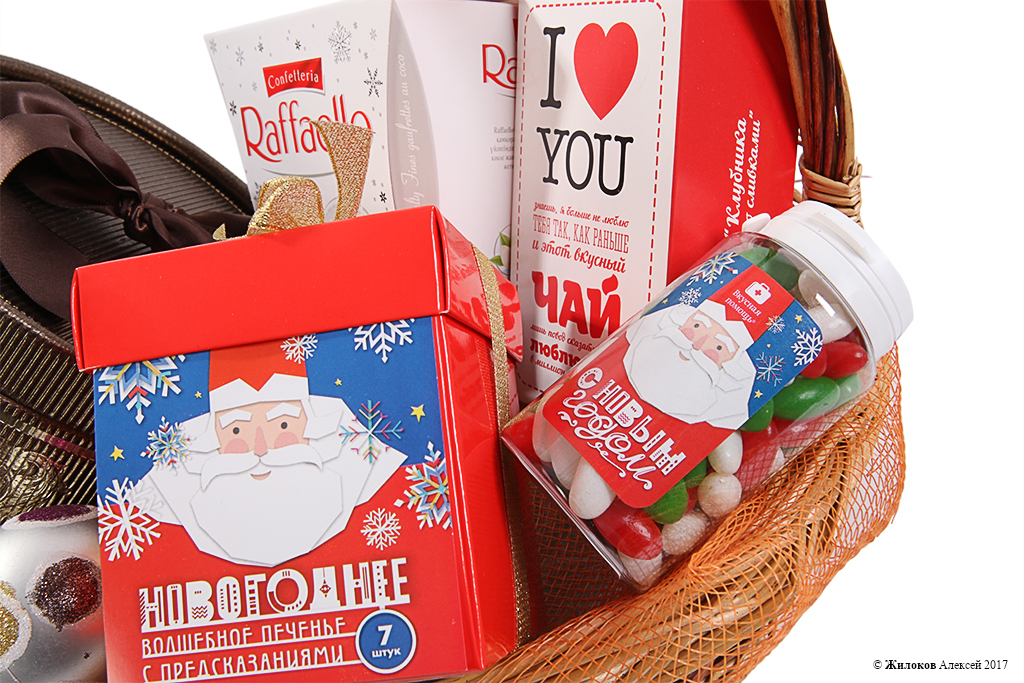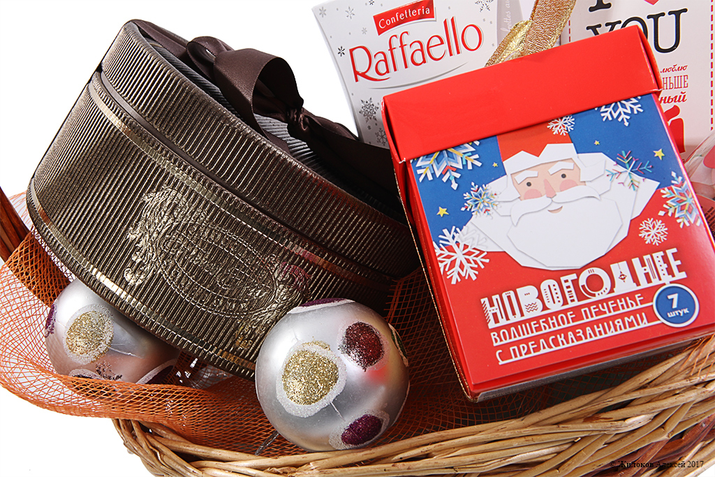 Состав: Набор конфет "French Kiss" - 1Набор конфет Raffaello (150 г) - 1 Чай "Люблю" - 1 Печенье с предсказаниями "Новогоднее" - 1 Вкусная помощь «С Новым годом!» (150 мл) - 1 Шар новогодний - 3 Корзина средняя - 1 |