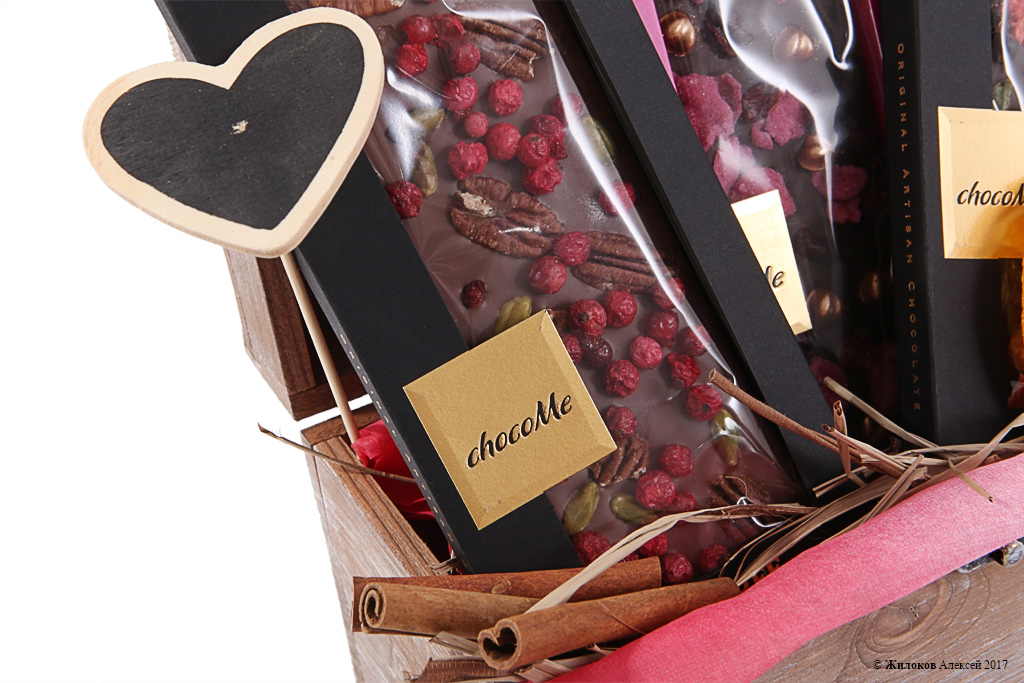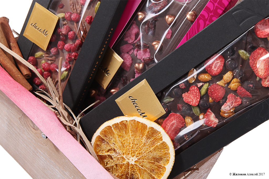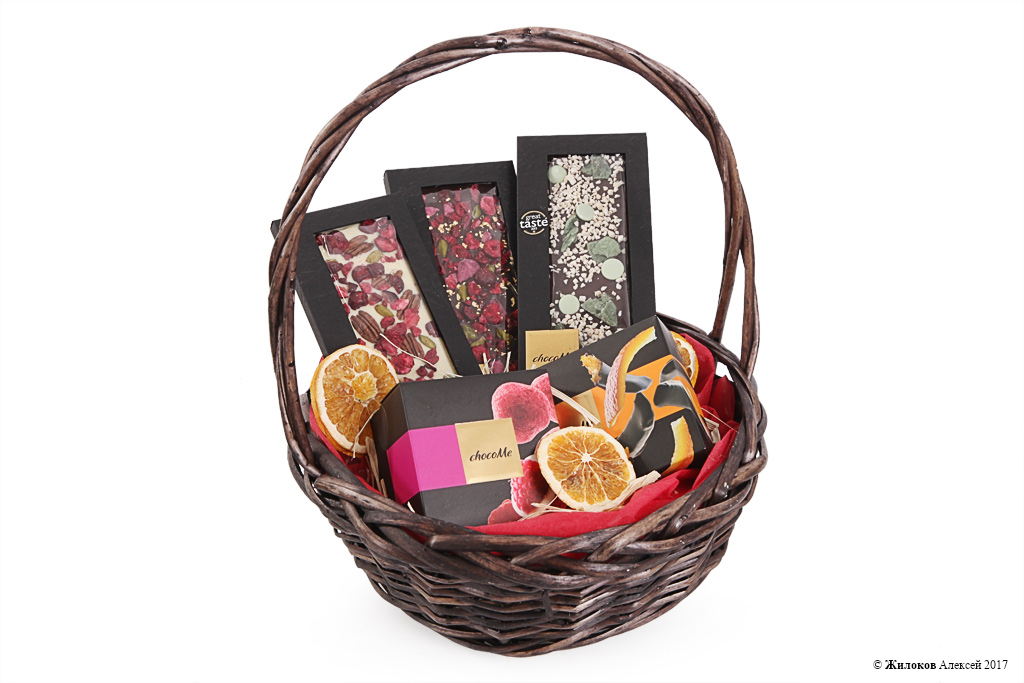 Состав: Малина в белом шоколаде ChocoMe (RF106) - 1Дольки апельсина в шоколаде ChocoMe (VL101) - 1 Шоколад белый ChocoMe «Вишня+малина+орехи»(MG116) - 1 Шоколад горький ChocoMe «Фисташки+вишня+лепестки роз» (V105) - 1 Шоколад горький ChocoMe «Мята+лимонная цедра+лайм» (F102) - 1 Корзина малая - 1 |
