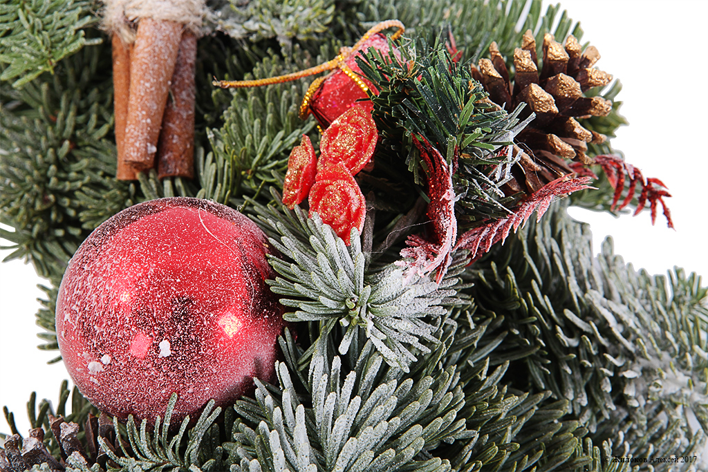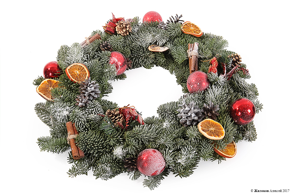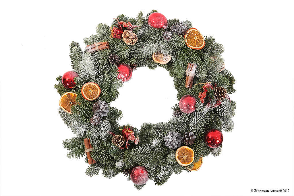 Описание: Классический рождественский венок из зеленых веточек ели, украшенный блестящими новогодними шарами и игрушками, шишками и яркими дольками апельсина – вот лучшее украшение для любого дома в этот светлый праздник! |