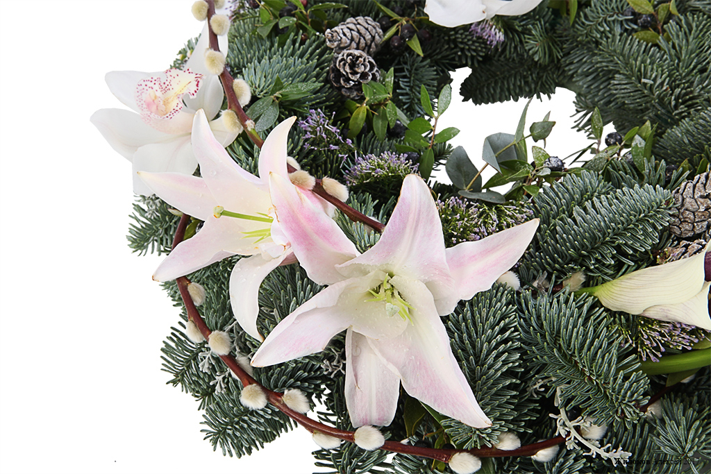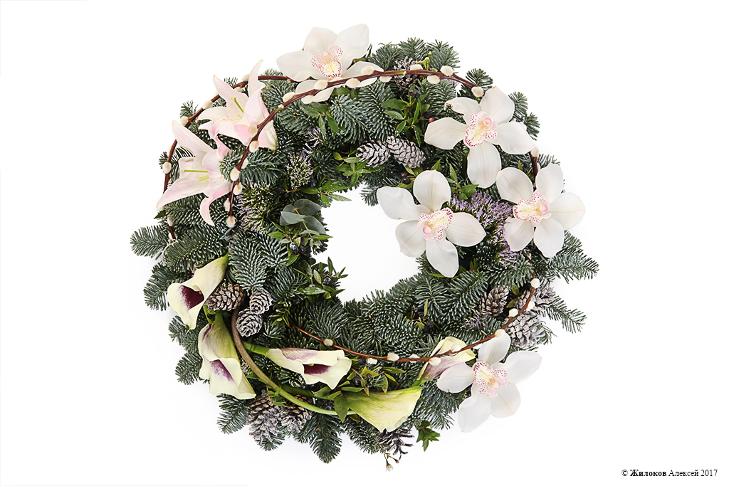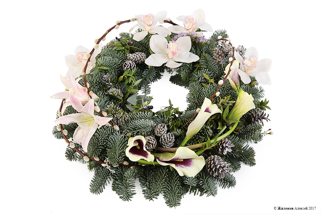 Описание: Торжественный рождественский венок из сосновых веточек, украшенный нежными орхидеями и элегантными каллами белого цвета, создаст в доме неповторимую атмосферу самого долгожданного зимнего праздника, подарит душевное тепло и любовь Вашим близким. |
