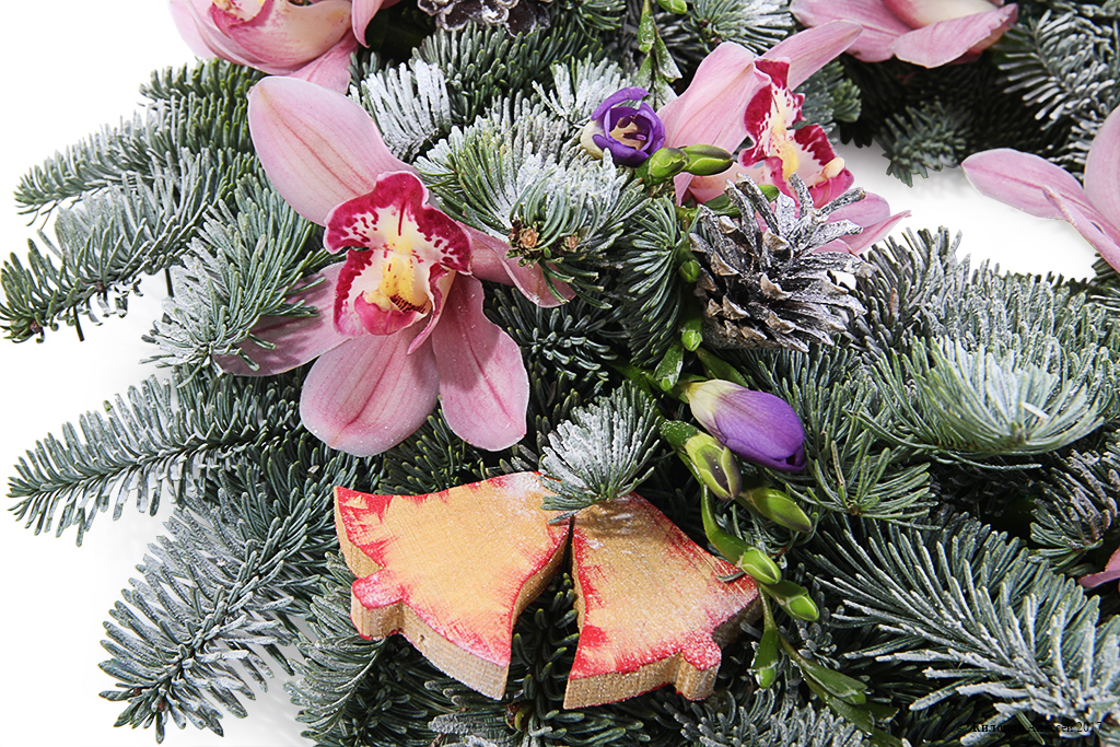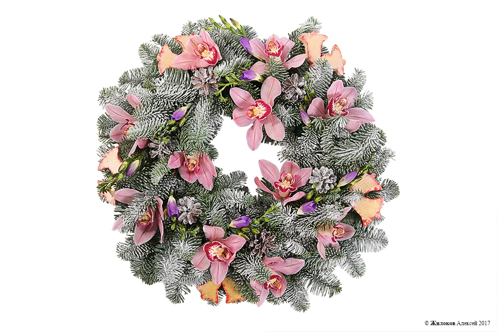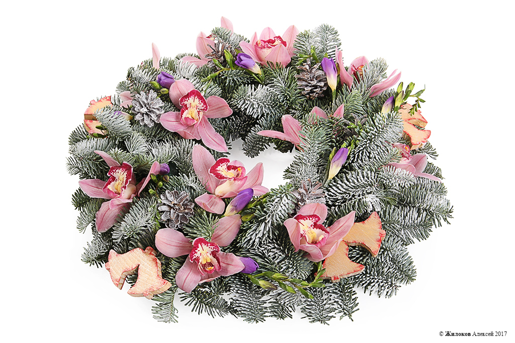 Описание: Настоящий рождественский венок из хвойных веточек, украшенный шишками и колокольчиками, и, конечно, цветами – тропической орхидеей цимбидиум и нежной фрезией. Идеальный подарок для родных и близких, который принесет в дом атмосферу праздника и ожидания чуда! |