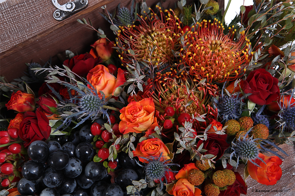 Состав: Роза Дип Перпл - 101Салал - 1 Корзина средняя - 1 |