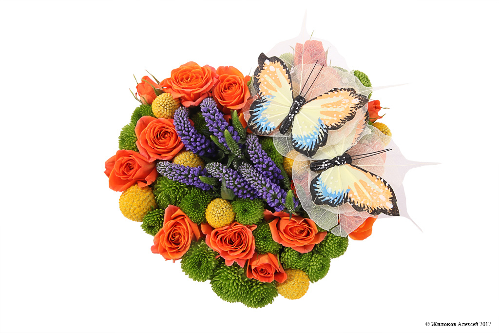 Состав: Роза кустовая (Кения) - 3Хризантема Сантини - 3 Вероника - 6 Краспедия - 10 Декор "Бабочка" - 2 Листья скелетированные - 6 Коробка "Сердце" мини (19х17х9) - 1 |