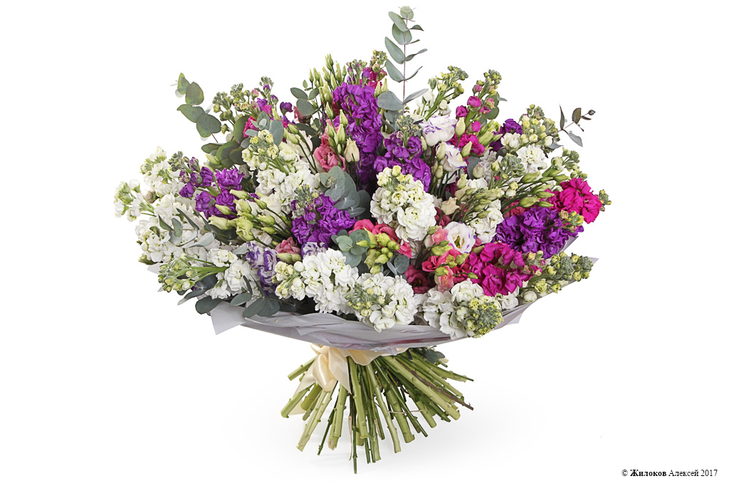 Благодаря этому роскошному букету любой дом наполнится ароматами цветущей весны в любое время года. Великолепное сочетание фиолетовой и ярко-малиновой маттиолы, белоснежной эустомы и зелени эвкалипта создаст хорошее настроение и станет оригинальным подарком для близкого человека. Такой букет - это яркое и памятное выражение Ваших самых сокровенных чувств!