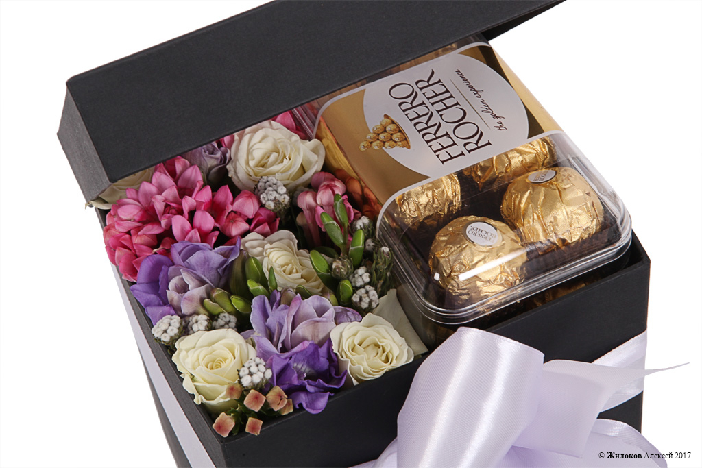 Такой подарок сочетает в себе 2 удовольствия - это эстетическое удовольствие от великолепной цветочной композиции и сладкое удовольствие от вкуснейшего набора шоколадных конфет Ferrero Rocher! Беспроигрышный вариант презента для сладкоежки!