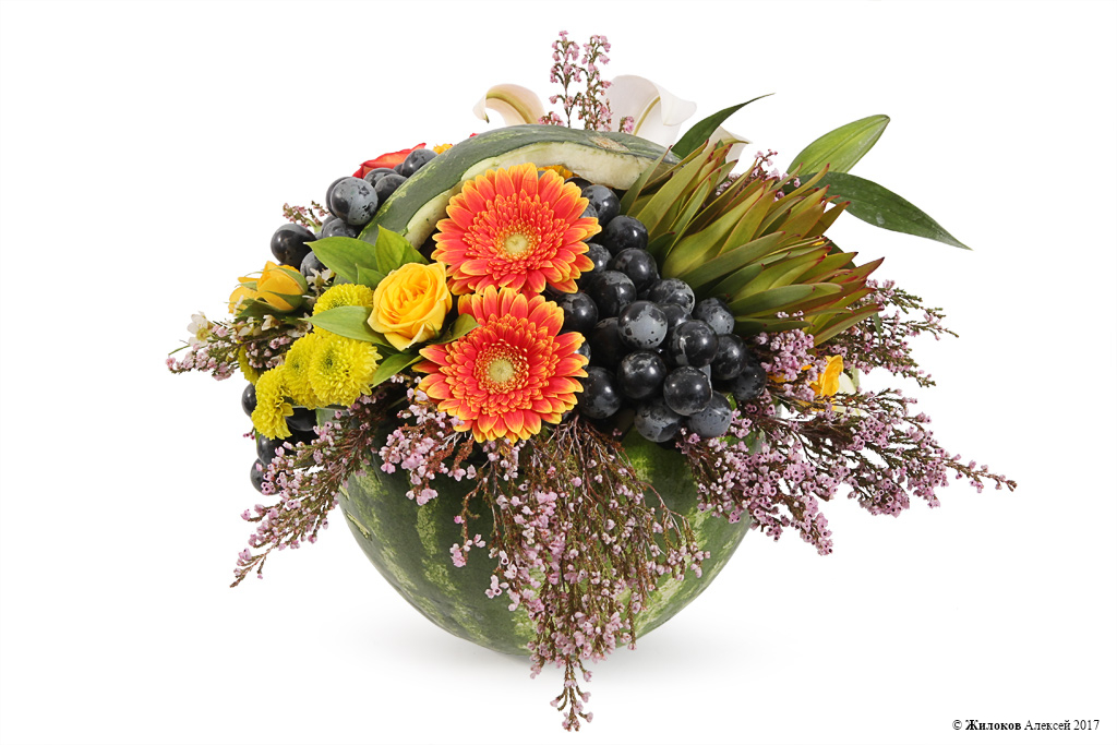 Описание: Необычная и яркая цветочная композиция в настоящем арбузе и с декором в виде винограда - это приятное напоминание о жарком и урожайном лете. А такие составляющие букета как эквадорские оранжевые и желтые розы, белоснежные лилии, леукадендрон унесут мысли получателя в далекий мир тропической экзотики! |