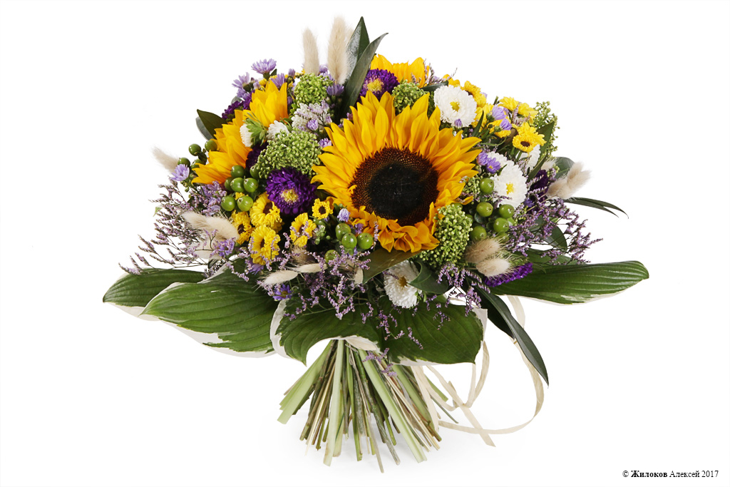 Состав: Подсолнух (гелиантус) - 5Гиперикум - 5 Лимониум - 1 Скиммия - 1 Лагурус - 1 Каллистефус - 2 Хризантема Сантини - 3 Хоста - 10 Астра - 10 |