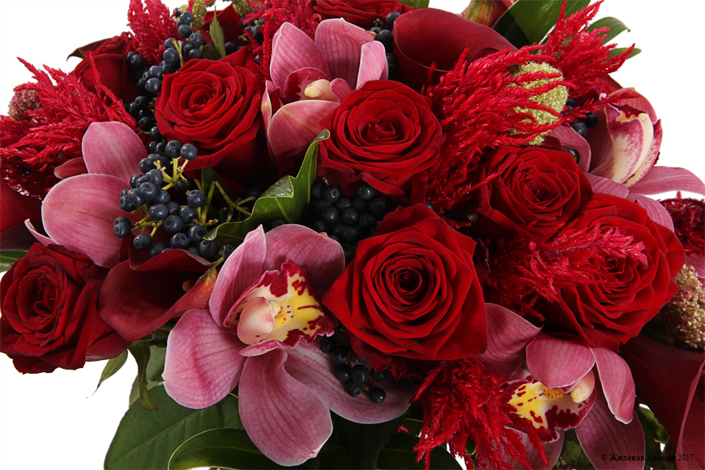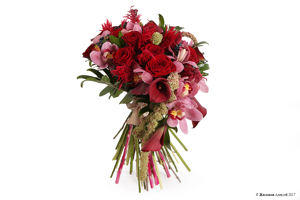 Состав: Роза Ред Наоми - 13Калла - 11 Орхидея Цимбидиум - 1 Амарантус - 10 Вибурнум - 10 Целозия - 10 Филодендрон - 10 Удлинители для орхидей - 11 |
