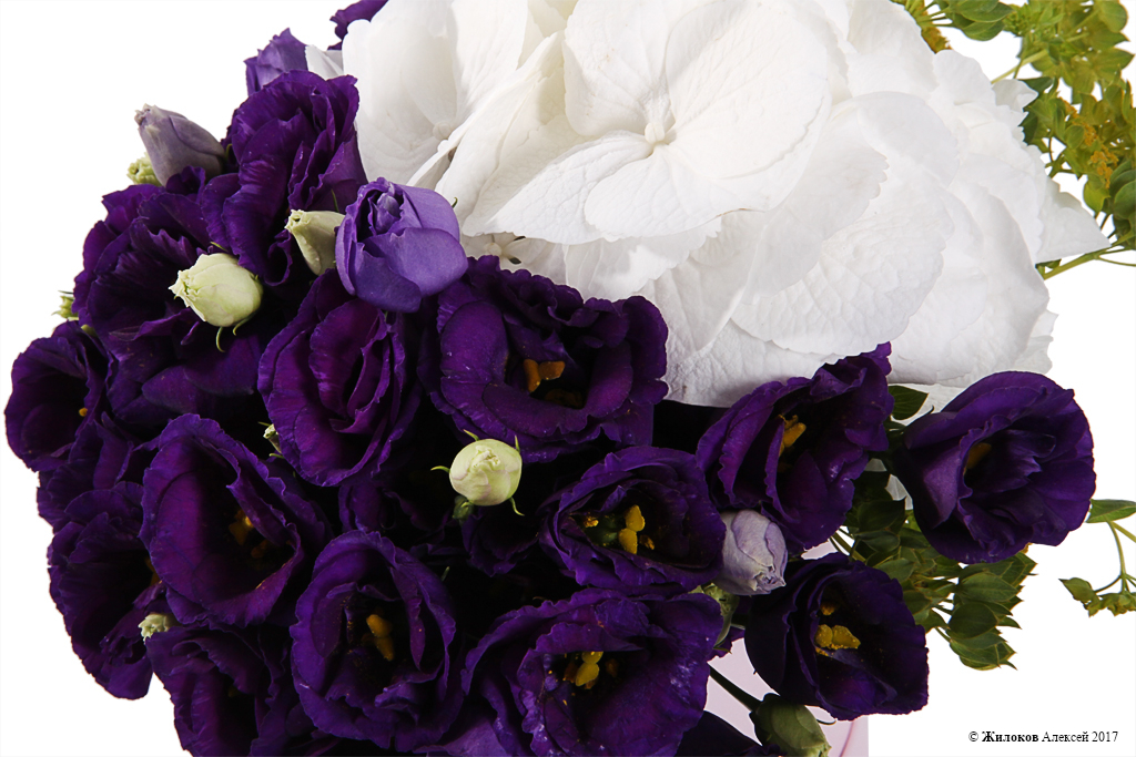 Миниатюрная цветочная композиция из невероятной фиолетовой эустомы и белоснежной гортензии станет милым и трогательным презентом, изящным комплиментом милой сердцу даме. Нежно-розовая коробочка, в которой составлен букетик, придаст всей композиции нотку романтики, изящно подчеркнет красоту цветов!