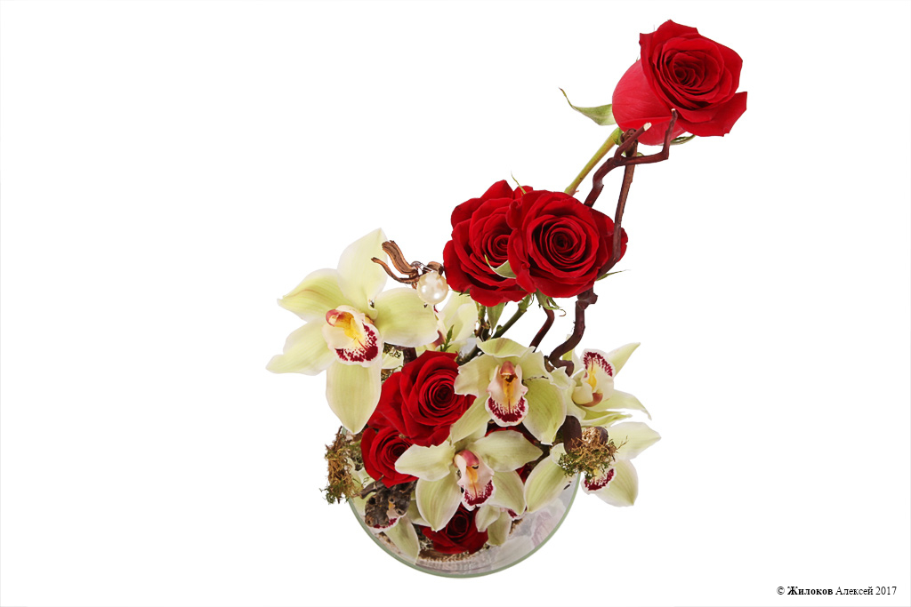 Состав: Роза Фридом - 7Орхидея Цимбидиум - 1 Ветка декоративная - 3 Лоза "Дрова" - 0.5 Мох плаун (100 г) - 0.5 Удлинители для орхидей - 9 Ваза цилиндрическая (30 см) - 1 |