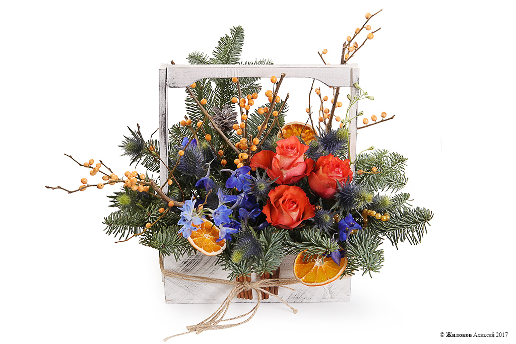 Состав: Кашпо "Ящик с ручкой" - 1Илекс - 3 Нобилис - 3 Дельфиниум - 1 Эрингиум - 5 Роза одноголовая (Эквадор) - 3 Долька апельсина - 3 Украшение "Шишка" - 3 |