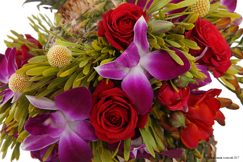 Состав: Роза Мирабель - 2Платиспермум - 1 Орхидея Дендробиум - 5 Фрезия - 10 Краспедия - 9 Ананас Голден - 1 |