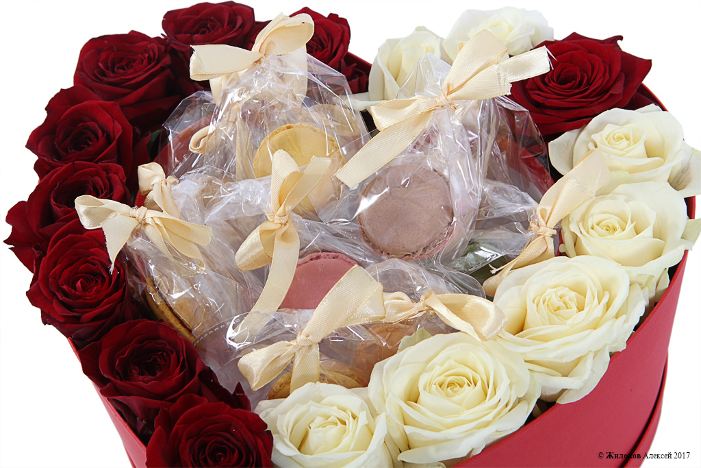 Цветочная композиция из бордовых и белых роз, составленная в коробке в форме сердца, покорит с первого взгляда! Это прекрасный и желанный подарок для любой девушки! Также великолепным дополнением к цветам послужит превосходное французское лакомство - пирожные макарун, которые придутся по вкусу любому сладкоежке!