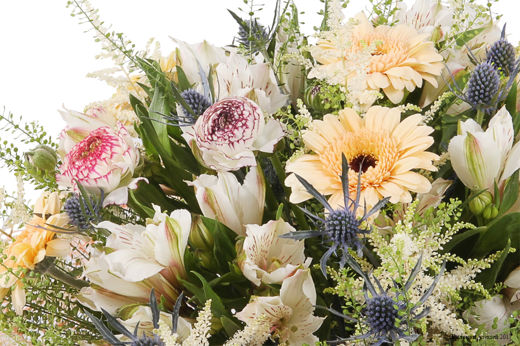 Состав: Гербера мини - 7Альстромерия - 5 Ранункулюс - 5 Эрингиум - 7 Астильба - 10 Ярутка - 1 Упаковка - сетка - 1 |