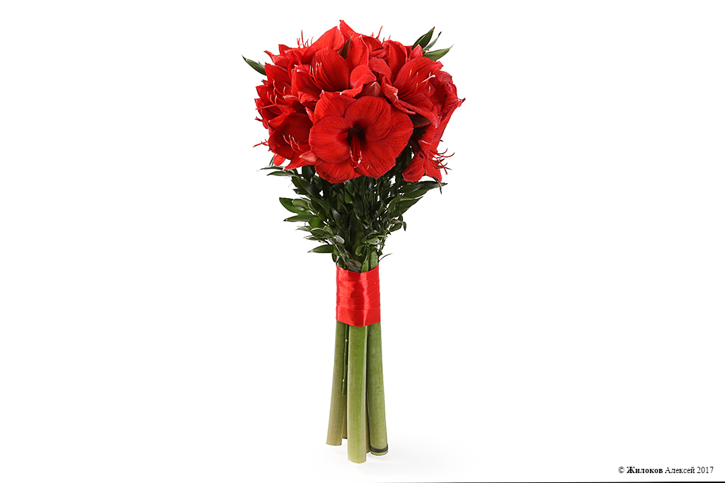 Состав: Гиппеаструм - 6Рускус Акулеатус - 1 Атласная лента - 1 |