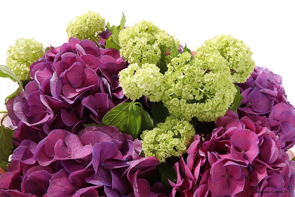 Описание: Пышные шапки фиолетовой гортензии в сочетании с бело-зелеными цветочками вибурнума очаровывает, обвораживает и пленит своей красотой. Такой букет сделает любое поздравление прекрасным и запоминающимся, привнесет настроение праздника и летней беззаботности!