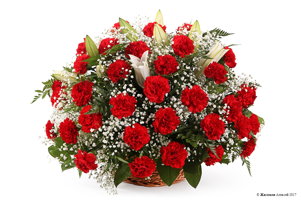 Контрастная цветочная композиция из белоснежных лилий, воздушной гипсофилы и ярких гвоздик подарит фейерверк красочных чувств и эмоций. Прекрасное украшение любого интерьера на любой праздник либо торжество!