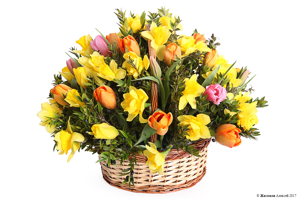 Состав: Нарцисс (деффодайл) - 30Тюльпан - 30 Мирто - 3 Корзина малая - 1 |