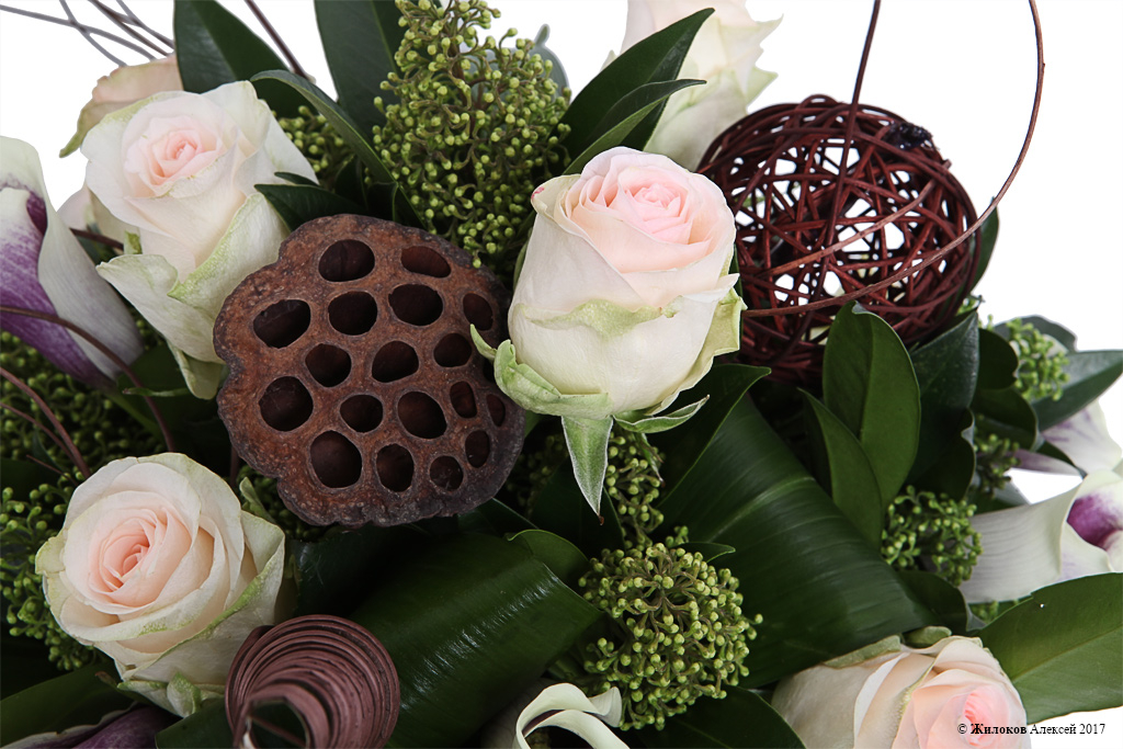 Описание: Элегантная, стильная и современная цветочная композиция из прекрасных роз с белыми бутонами с розовой серединкой, двухцветных калл, аспидистры и скиммии. Оригинальным такой букет делает фантастический декор, а голубая шляпная коробка добавляет шарма. Все эти особенности делают эту композицию идеальным вариантом подарка для творческих и неординарных личностей! |
