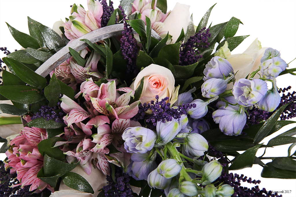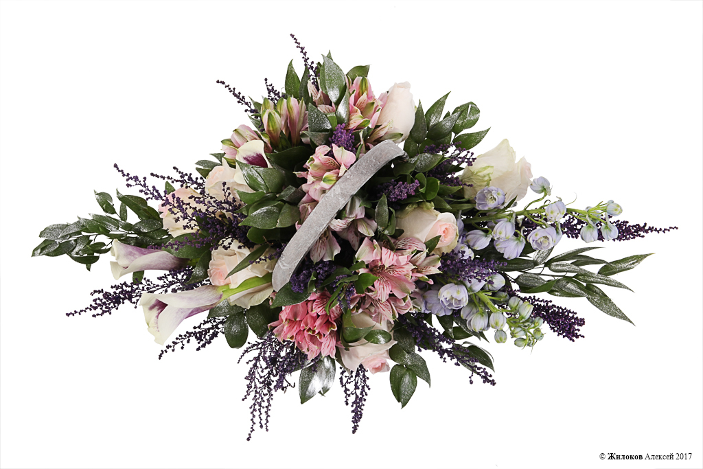 Состав: Роза Сеньорита - 7Альстромерия - 5 Калла - 3 Штёбе (банч) - 0.5 Рускус Акулеатус - 0.5 Корзина Basket stripes - 1 Дельфиниум - 2 |