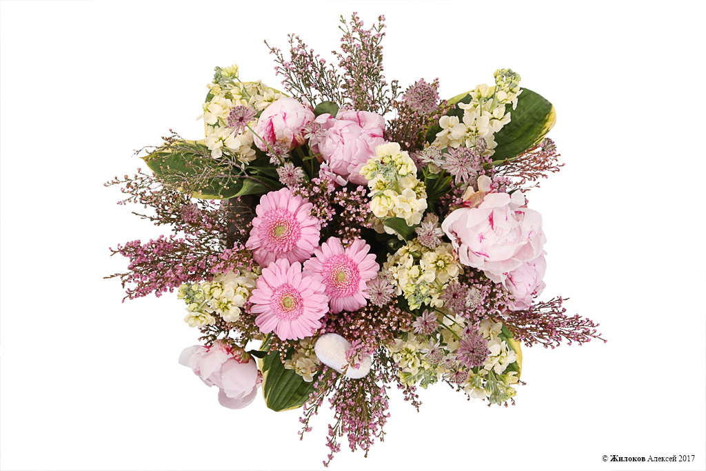 Состав: Кашпо "Колыбель" - 1Пион - 5 Гербера мини - 3 Астрантиа - 5 Маттиола - 9 Хоста - 5 Эрика - 1 Декор "Сердце" - 1 |