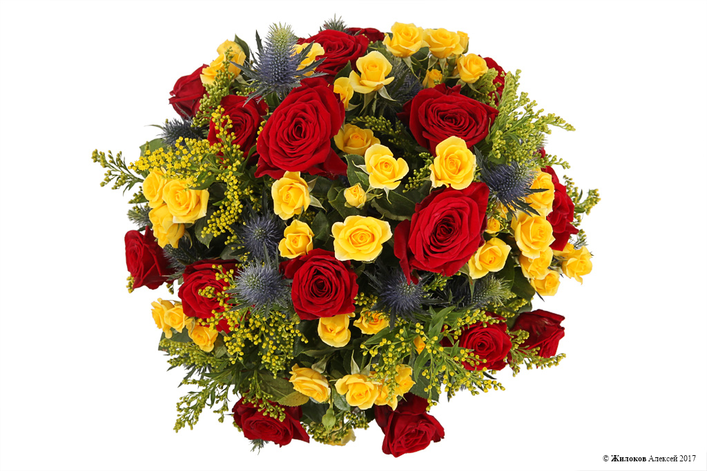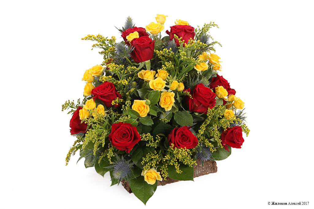 Описание: Цветочная композиция в красно-золотых тонах выглядит по-королевски изысканно и роскошно. Выполненная в форме сердца, она создана для того, чтобы говорить о любви и страсти, восхищении и обожании. Против ее красоты не устоит ни одна прекрасная дама! |
