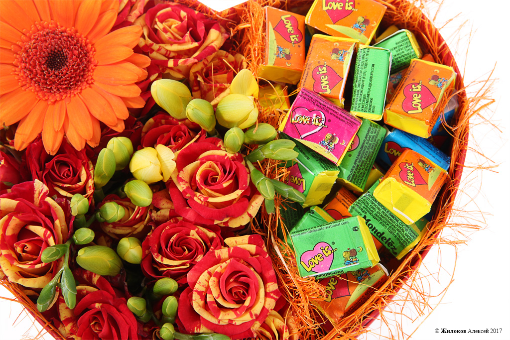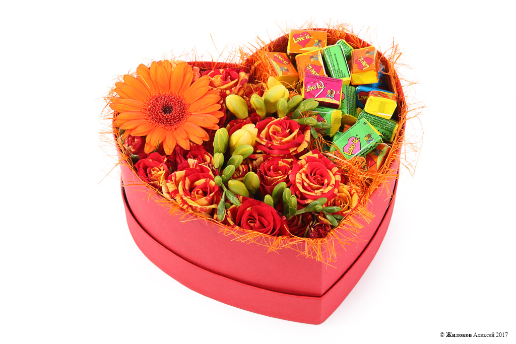 Настоящую вспышку чувств и пожар любви символизирует эта цветочная композиция в коробке в форме сердца. Ведь главная роль здесь отведена невероятно эффектной розе Фаер Флеш с бутонами ярко-красного цвета и жёлтыми полосами на лепестках. Также прекрасным дополнением к такому подарку служит жевательная резинка Love is, которая добавит в праздничную атмосферу нотки романтики и детской искренней радости.