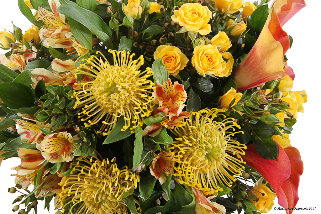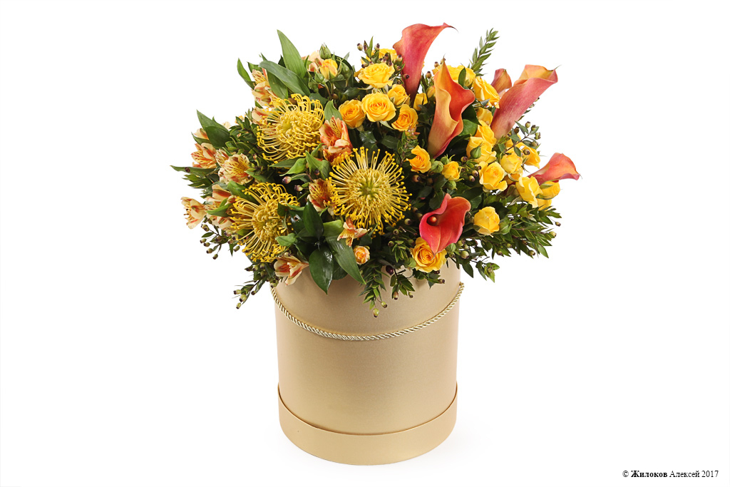 Описание: Эффектный букет в желто-оранжевых оттенках из экзотических шаров леукоспермума, кустовых роз и элегантных калл дополнен стильной шляпной коробкой золотого цвета. Такой подарок станет яркой вспышкой радости и красоты на любом празднике и не останется незамеченным. |