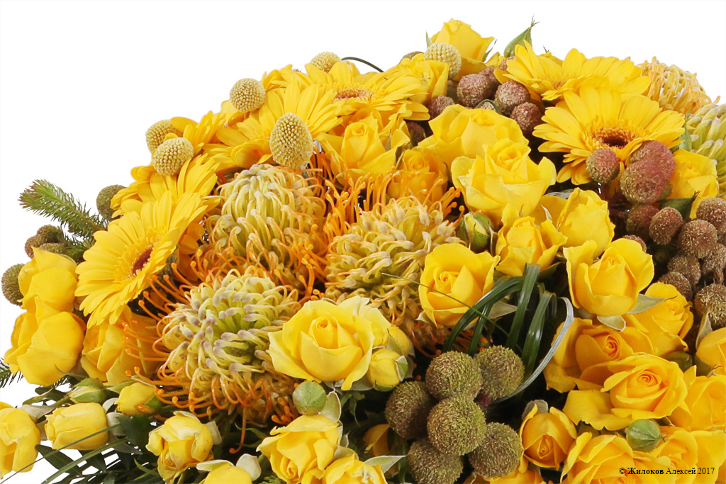 Описание: Букет в желтых тонах, в золотистой шляпной коробке – это настоящее сокровище, которое Вы можете подарить с самыми теплыми пожеланиями. Герберы, экзотические шары леукоспермумов и множество маленьких розочек создают восхитительную гармонию, а асимметричный шлейф из свежей зелени делает вид букета еще эффектнее. |