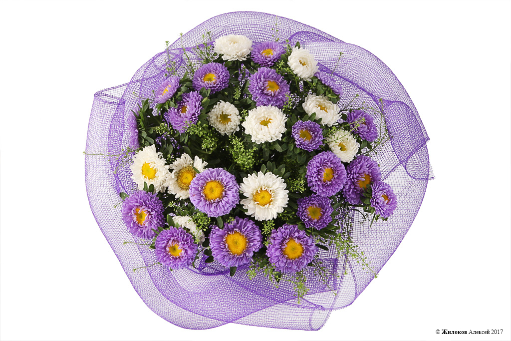 Необыкновенно сказочный букет приятной бело-фиолетовой палитры из пышных цветов семейства Астровые - каллистефусов. Фиолетовый цвет, согласно учению фэн-шуй, означает богатство и успех. Именно поэтому, такой букет станет эффектным и символическим подарком к любому торжеству и для любого получателя!