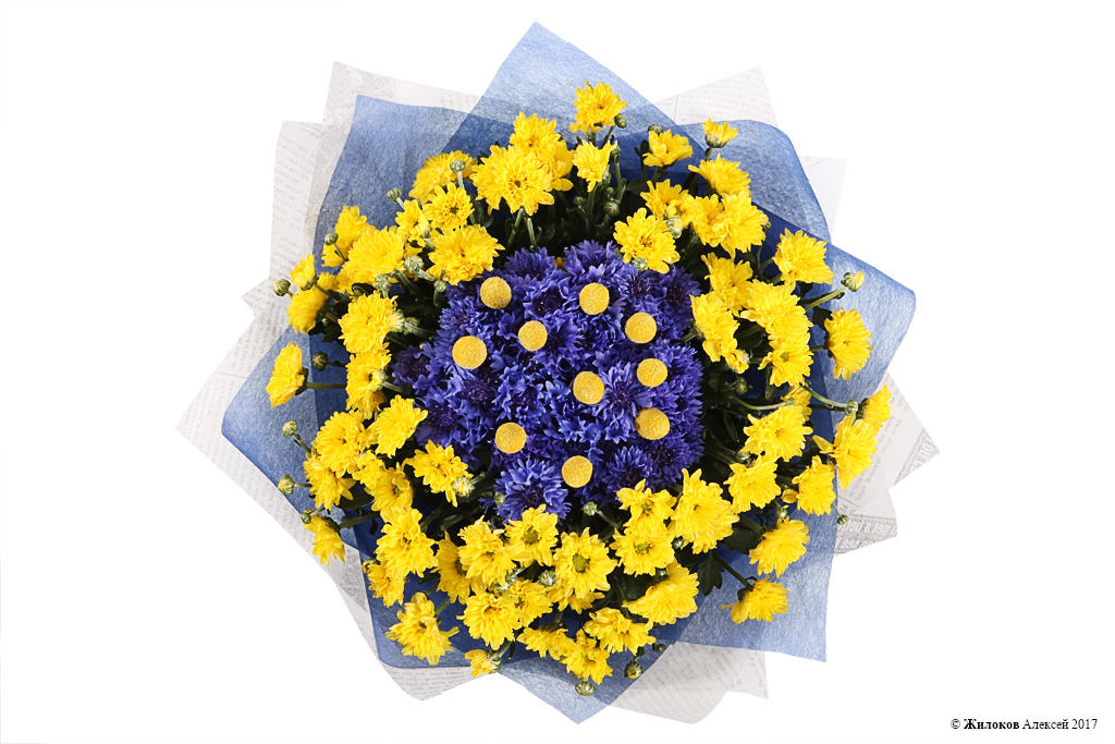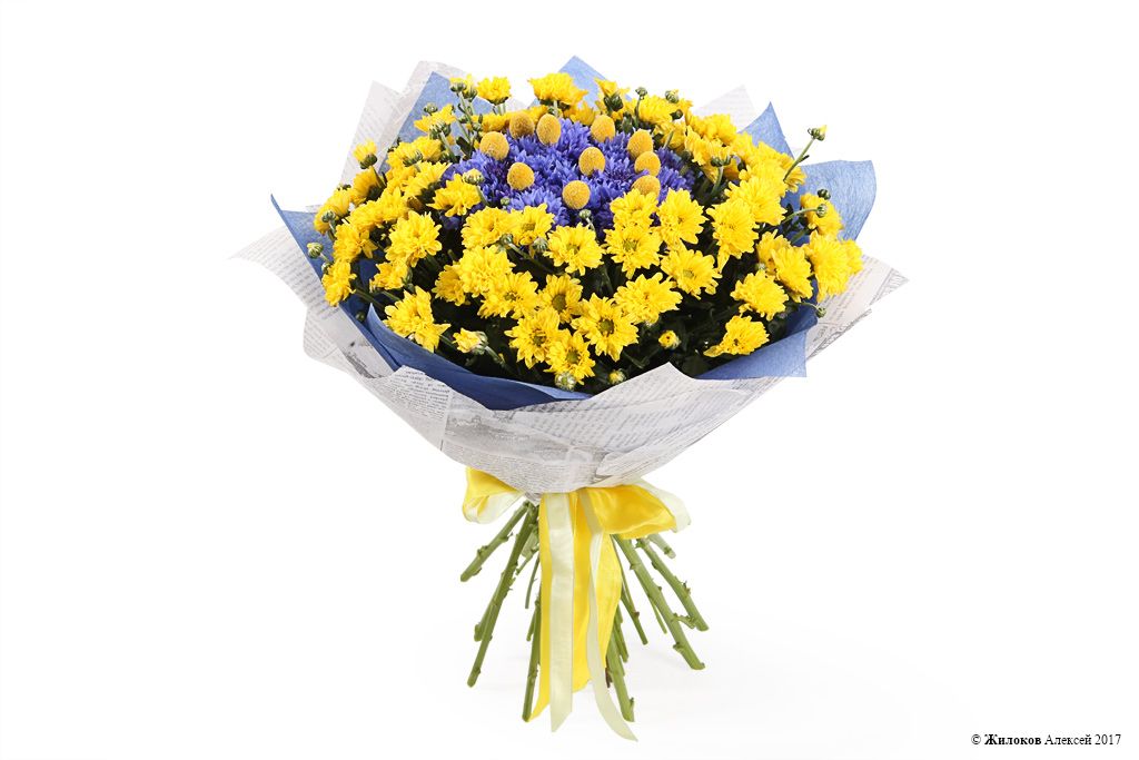Удивительный букет из небесно-синих васильков, желтой хризантемы и шариков краспедии порадует своего получателя своим ярким и позитивным цветом, - цветом счастья, радости и солнечного тепла. Это красочный букет станет прекрасным вариантом подарка, который раскрасит сочными красками серые будни!
