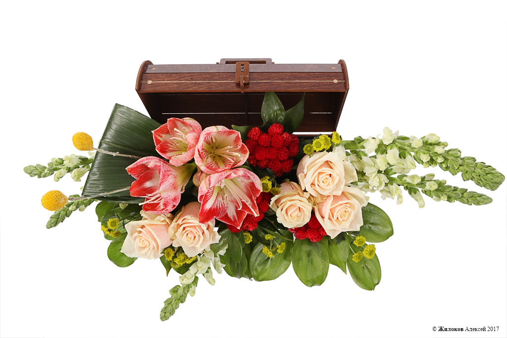 Описание: Эта яркая и в то же время нежная композиция из кремовых роз, гиппеаструмов и зелени поможет поздравить с любым праздником свежо и оригинально, поднять настроение и приятно удивить адресата. Кашпо в виде деревянного сундучка добавляет презенту налет очаровательной старины. |