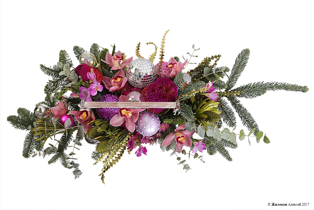 Состав: Нобилис - 3Фрезия - 5 Банксия - 2 Стриктум - 1 Хризантема кустовая - 2 Орхидея Цимбидиум - 1 Удлинители для орхидей - 7 Эвкалипт - 1 Шар новогодний - 6 Кашпо "Ящик с ручкой" - 1 |
