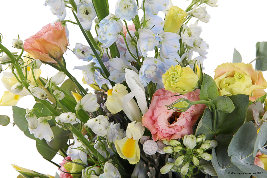 Состав: Ирис - 1Эустома - 1 Дельфиниум - 5 Эвкалипт - 1 Сильвер бруния - 1 Кашпо "Скворечник" - 1 |