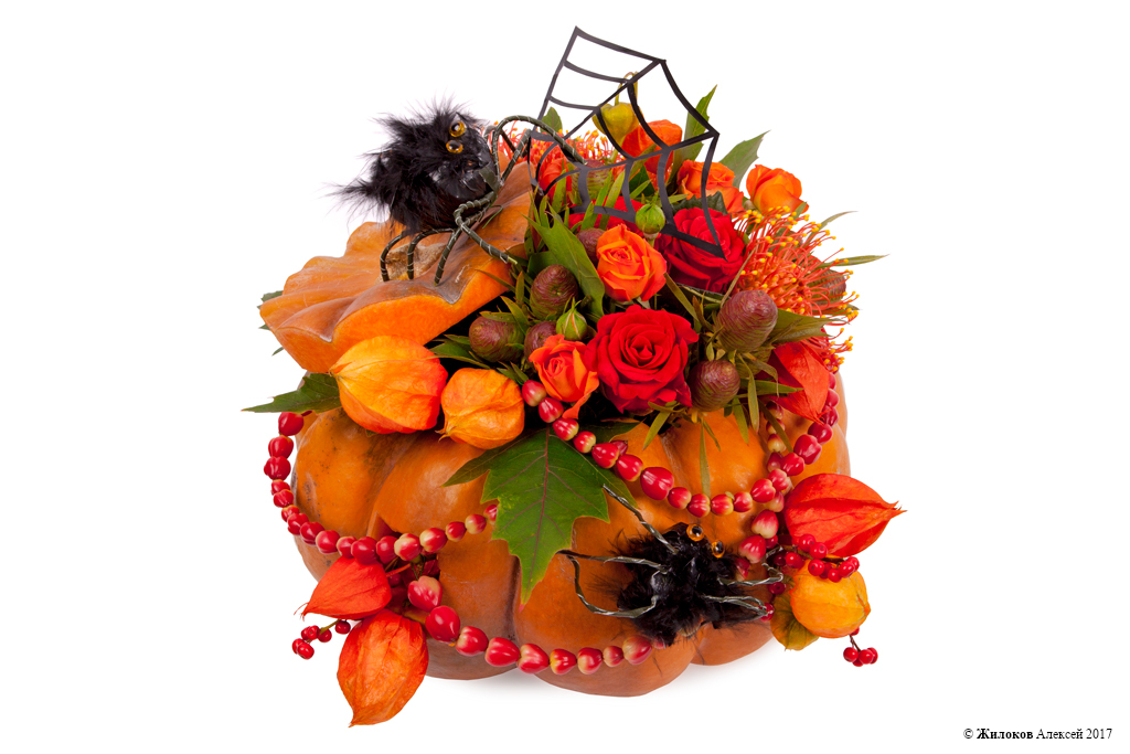Оригинальный и яркий осенний декор для дома, в котором в роли вазы используется тыква. Идеально подобранная цветовая палитра словно ослепляет сочными красками, а забавные мохнатые паучки с паутинкой предают композиции экспрессивности.