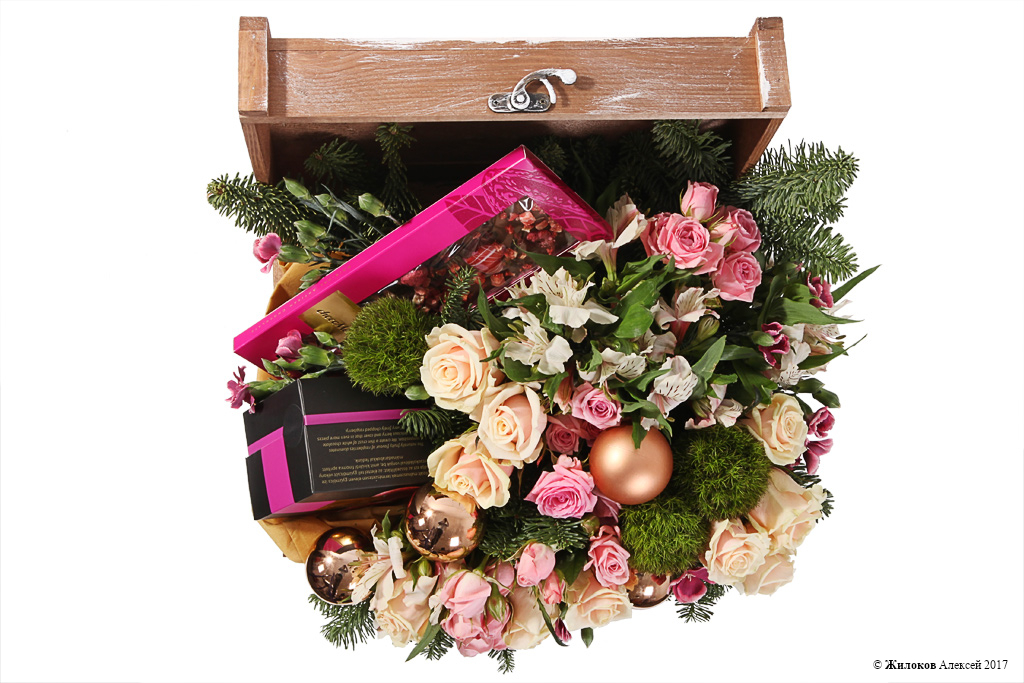 Описание: Сделать зимние праздники еще теплее и душевнее, еще ярче и радостнее поможет эта зимняя композиция в деревянном кашпо-шкатулке. Нежные кремовые розы и хвойная зелень, блестящие елочные шары и сладкие шоколадные дополнения помогут поздравлению стать незабываемым! |