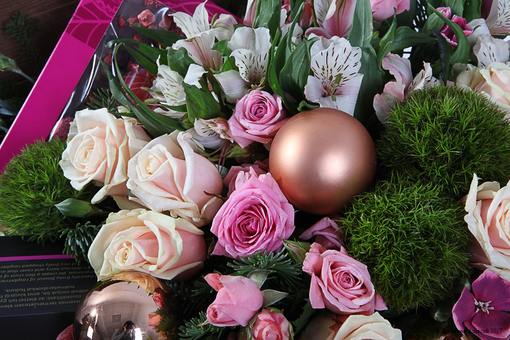 Состав: Гвоздика Тессино - 1Роза Талея - 10 Альстромерия - 5 Роза Одилия - 4 Нобилис - 3 Диантус барбатус (гвоздика турецкая) - 3 Шар новогодний - 4 Кашпо "Шкатулка Саваж" - 1 Сублимированная малина с белым шоколадом и тертой малиной - 1 Шоколад молочный ChocoMe «Любовь» (малина+брусника+клубника) - 1 |